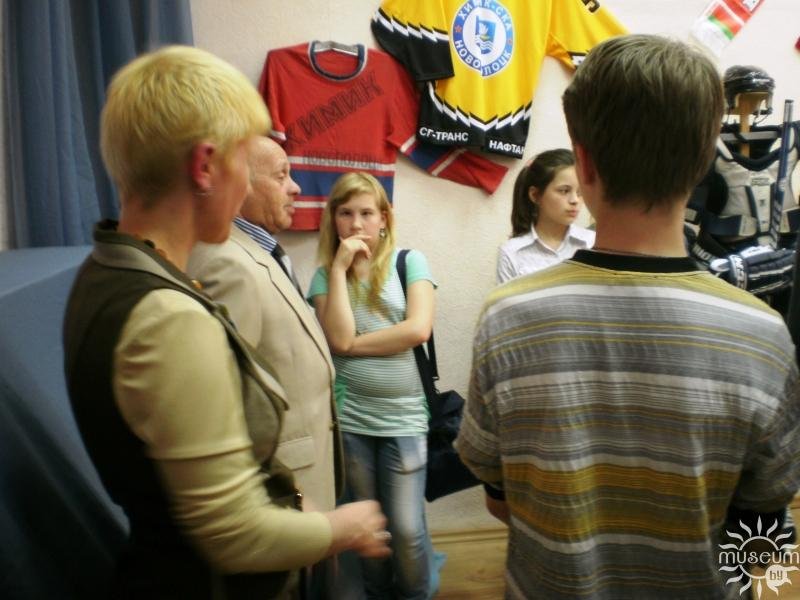 Праздничный вечер плавно перешел к событиям Чемпионат Мира по хоккею-2014. На выставку "Игра настоящих мужчин. Болеем за наших!", организованную совместно с ХК "Химик", сотрудники музея пригласили первого директора хоккейного клуба "Химик" Бляхмана Владимира Леонардовича и фанатов команды Анну Михайлову и Екатерину Соколову.