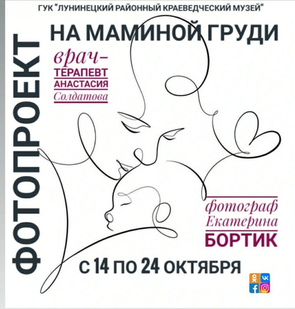 с 14 по 24 октября в ГУК "Лунинецкий районный краеведческий музей" можно познакомиться с фотопроектом врача-терапевта Анастасии Солдатовой и фотографа Екатерины Бортик "На маминой груди".